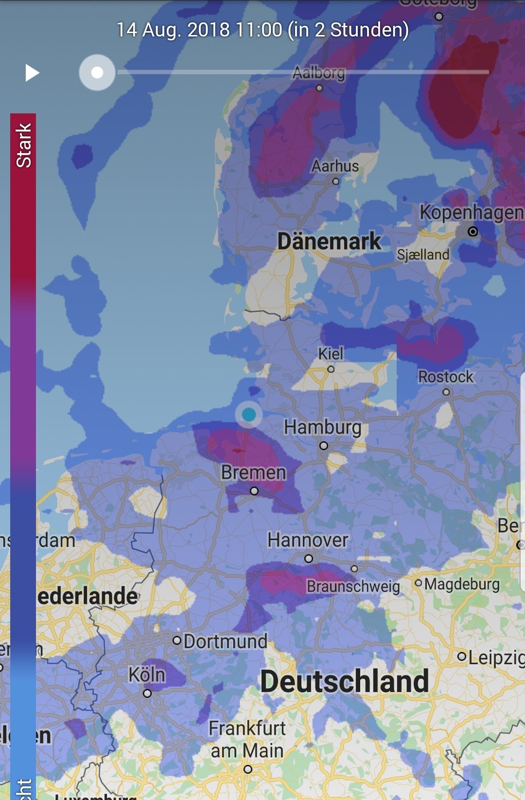 Nach 45 Minuten fast entspannten und gelassenem Abwarten sowie Studieren des Regenradars und der Wetter App im Foyer des hafenhostels, ist die Regenschauer durch. Ich sattele auf und fahre bei nur noch schwachem Nieselregen los. Zahlreiche andere Radurlauber starten auch zu diesem Zeitpunkt.