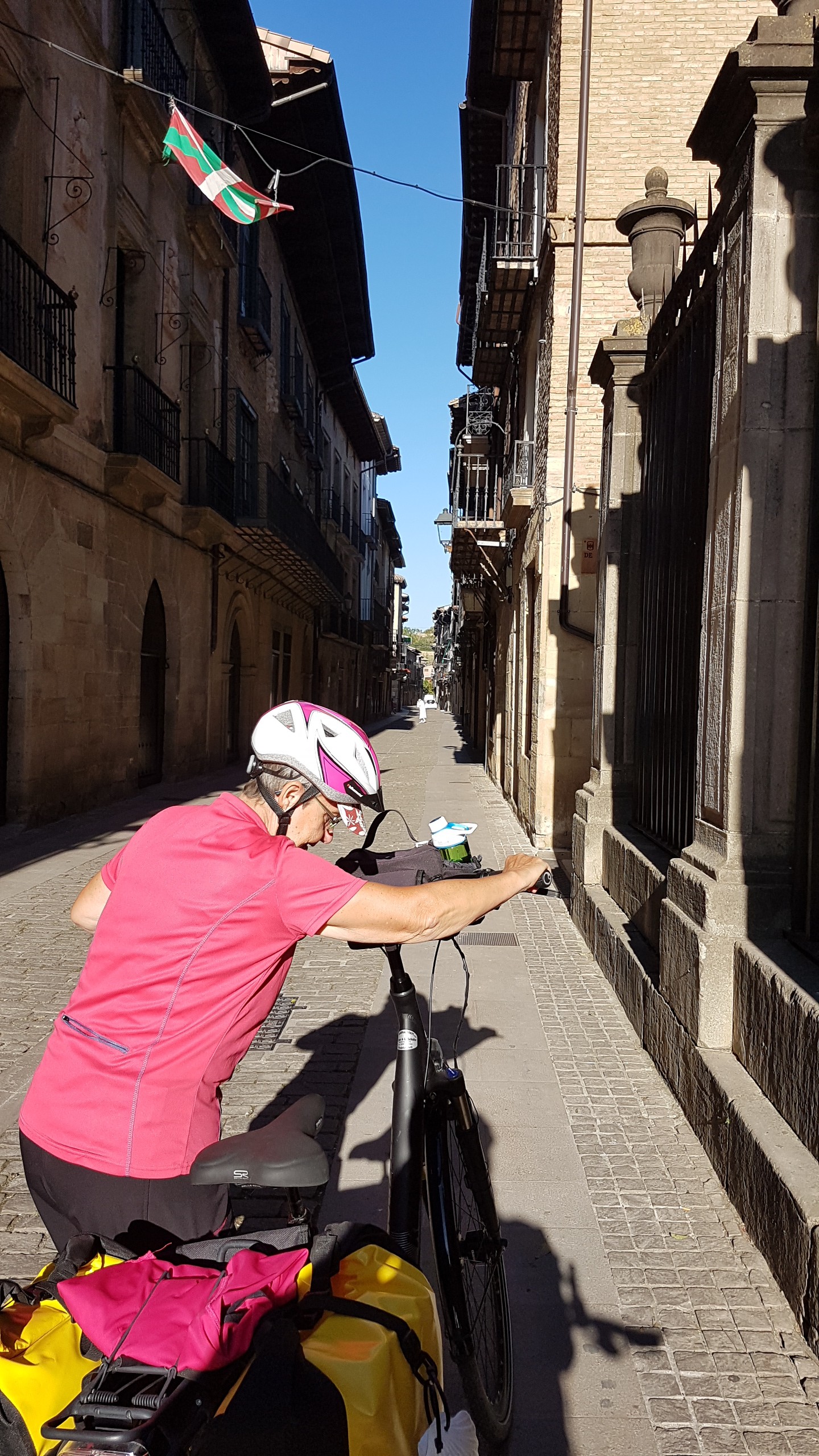 Als wir in Estella gegen 14 Uhr ankommen ist das Thermometer auf 40 °C im Schatten angestiegen. Wir belohnen uns jetzt natürlich mit dos cañas. Unsere beladenen Räder sind am Jakobsweg gut sichtbar. Binnen kurzer Zeit steigen hier weitere Radfahrer ab und machen Pause.