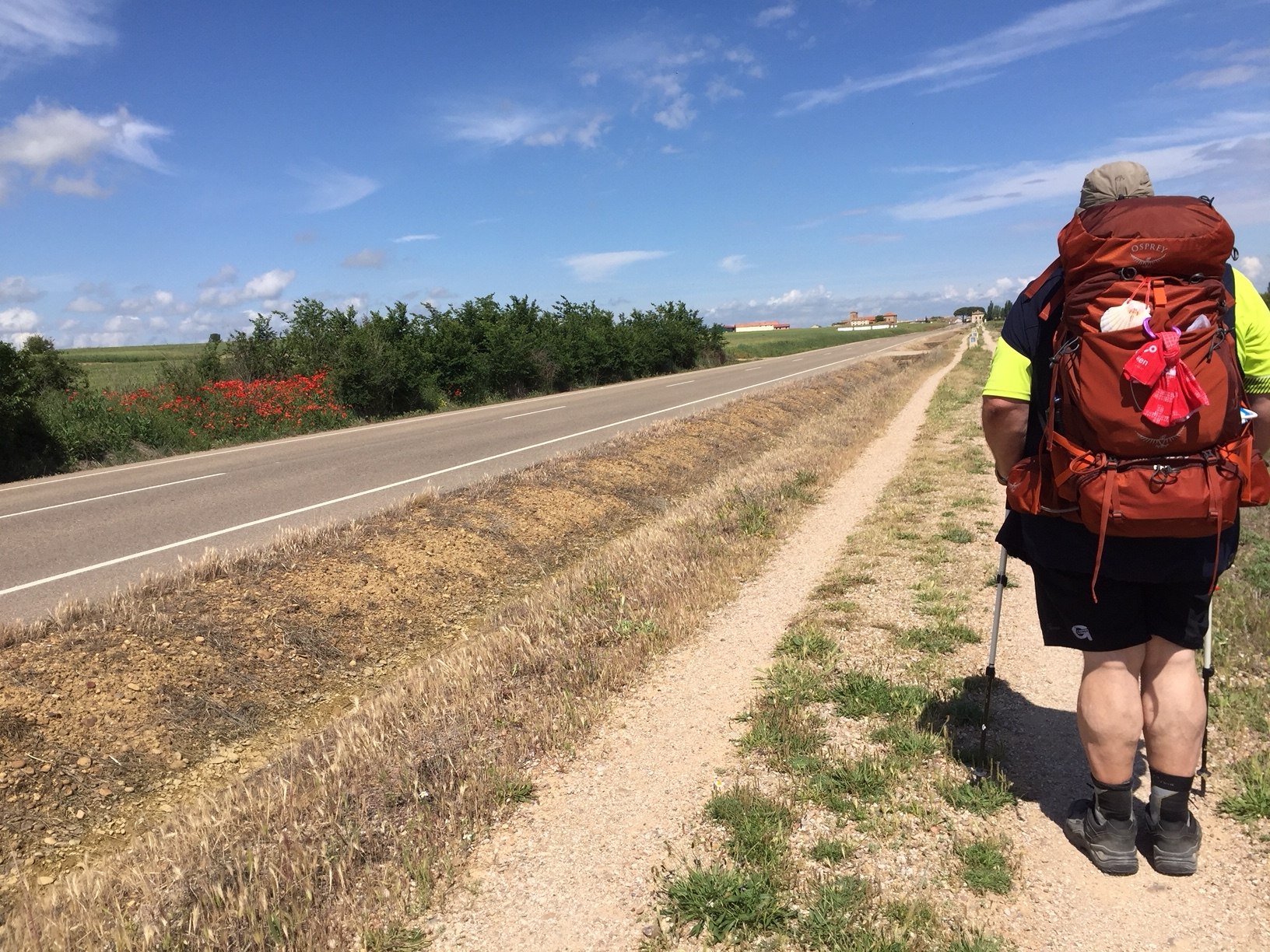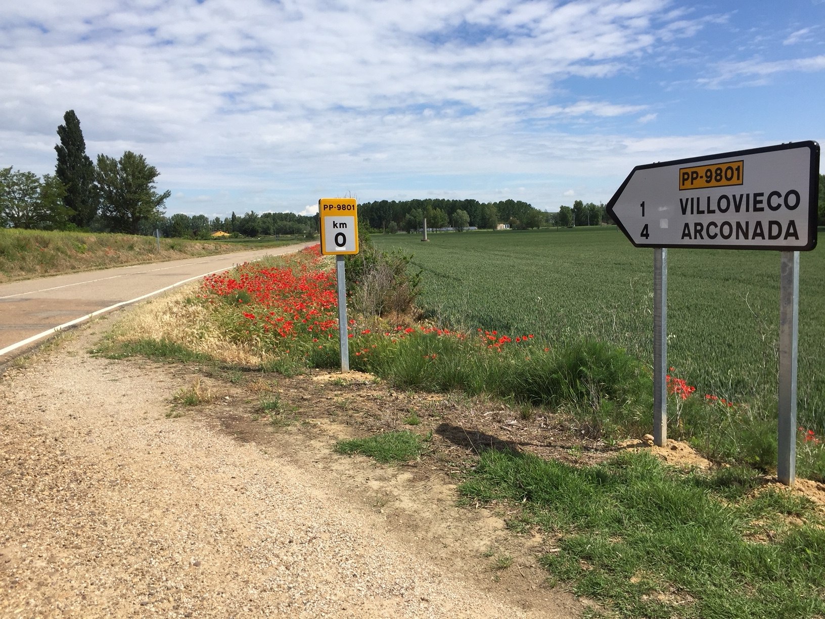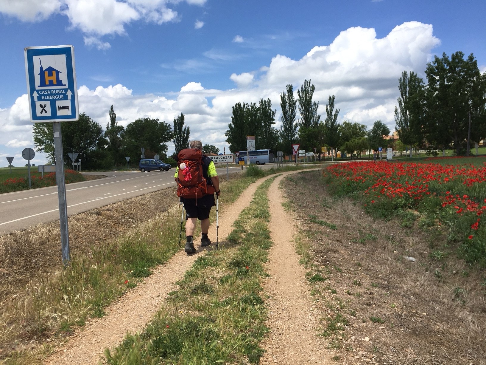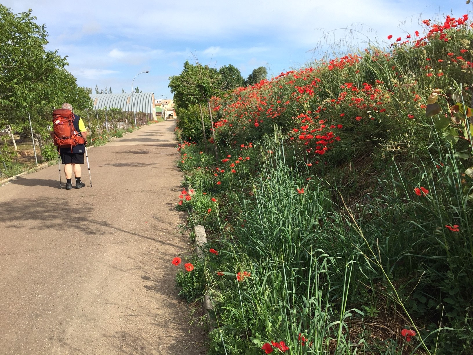 Heute zeigt sich die Meseta wieder mit einem anderen Gesicht. Es dominieren die Felder mit Getreide. Gerste, Roggen und Hafer sind meist noch grün, haben aber bereits Ähren angesetzt und das bekannte Braun der Meseta ist ansatzweise hier und da erkennbar. Die intensiv bewirtschafteten Flächen sind nicht so groß, wie in den letzten Tagen. Überall, wo die mechanisierte Landwirtschaft nicht hin kommt, dominieren die Blumen. Wir sehen hauptsächlich Mohn, aber auch wilde Rosen, Kornblumen, Ginster, Kamille, Glockenblumen, Malven und viele Wildkräuter. Einige davon kennen wir natürlich nicht.
