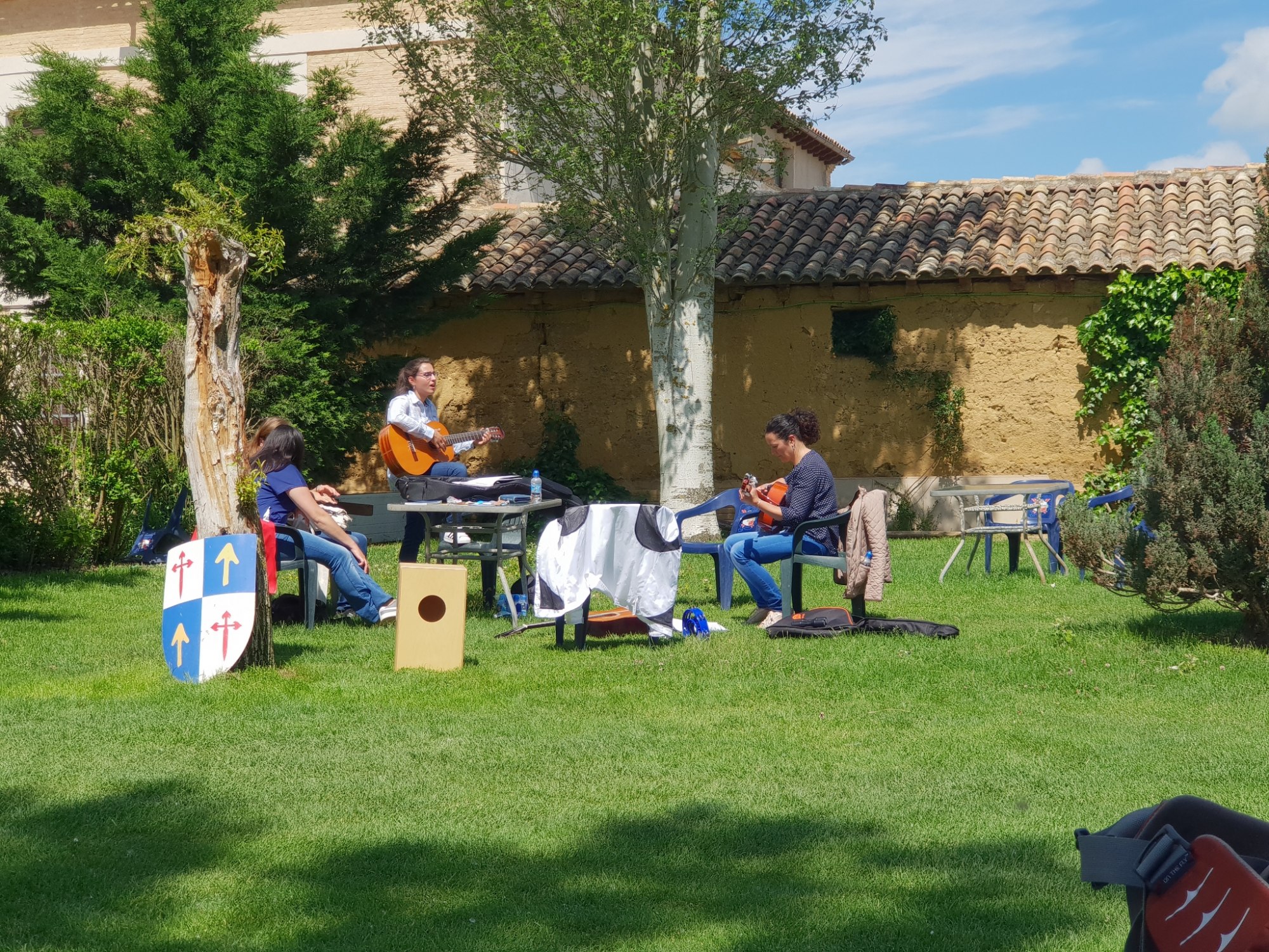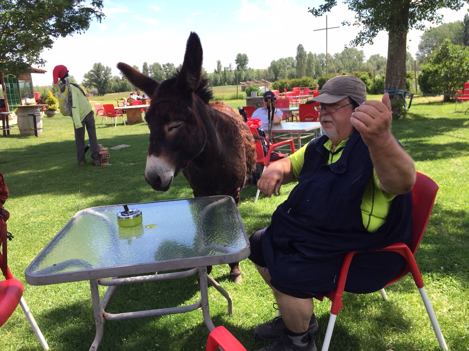 In der Mittagszeit machen wir eine längere Pause auf einem Campingplatz. Neben Gitarre spielenden und singenden Musikerinen bedient uns hier ein junger Esel. Im Schatten der Bäume treffen wir Pilger, die uns vorher überholt haben.