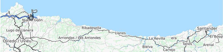 Oviedo, Meres, Pola de Siero, Villaviciosa, Fuente Santagueda, Grifo, Colunga, Ribadesella, Nueva, Posada, Llanes, Colombres,Ribadedeva, Unquera, Val de San Vicente, Alfoz de Lloredo, Santillana Del Mar, Cudón, Santa Cruz de Bezana, Santander