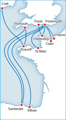 mit Fähre (Britanny-Ferries), Dauer ca. 9 Stunden, ca. x mal pro Woche