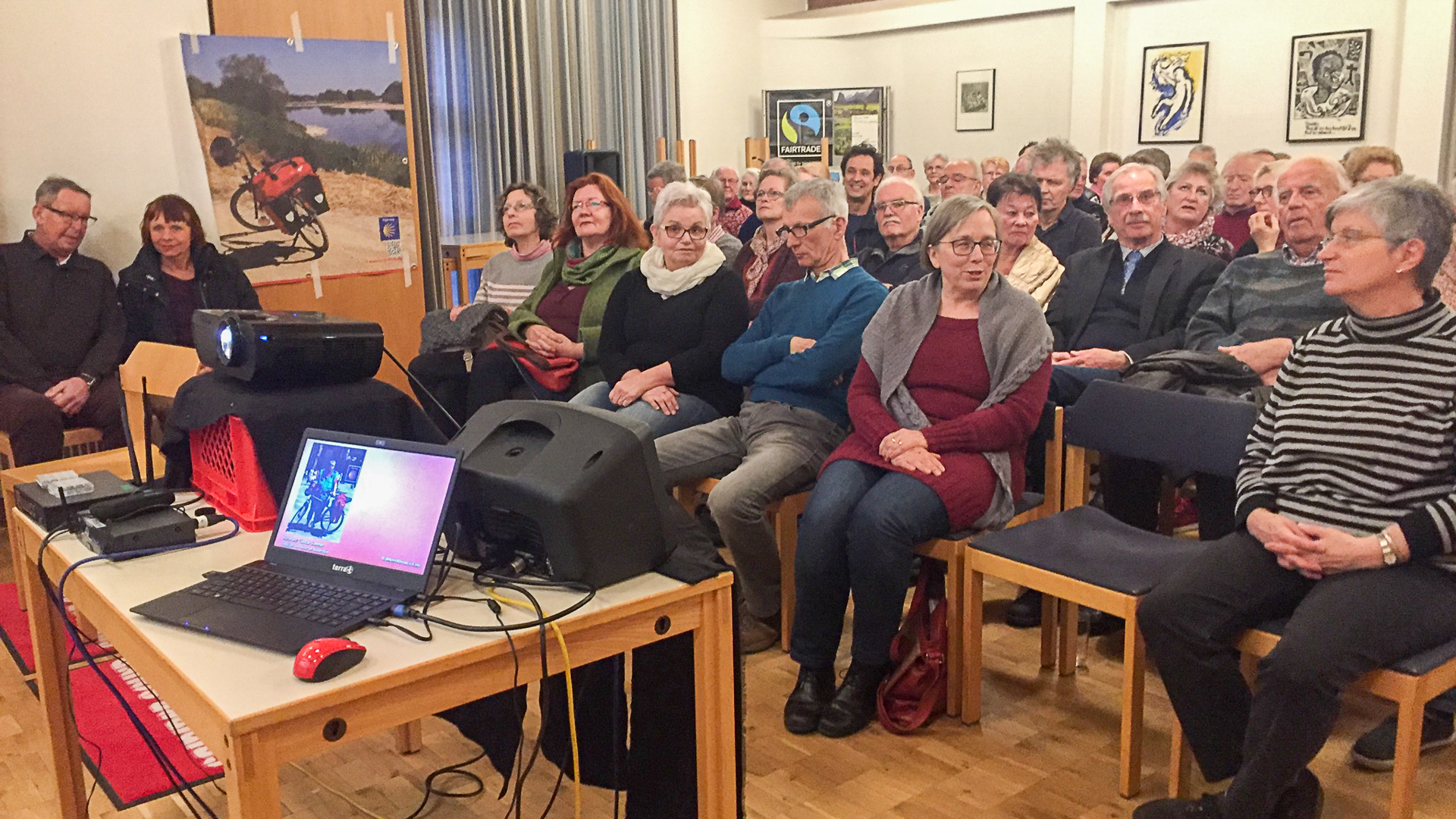 Über 115 interessierte und aufmerksame Zuhörer waren beim Multimedia Live-Vortrag in Drevenack dabei! Kurz vor 18 Uhr war dann auch der letzte auftreibbare Stuhl im überfüllten Gemeindehaus besetzt. Waltraud und Gustav Sommer berichteten knapp zwei Stunden von Ihren Erlebnissen mit dem Fahrrad „Auf den Spuren der Jakobspilger“. Die beiden zeigten Bilder und Filmsequenzen u.a. von den Westfälischen und Rheinischen Jakobswegen sowie von ihrer Pyrenäen-Überquerung und ihrer Weiterfahrt auf dem Camino Francés in Nord-Spanien. Mit einem langen Schlussapplaus belohnten die Zuschauer aus Nah und Fern die Radpilger und den Veranstalter: Netzwerk 50 plus.