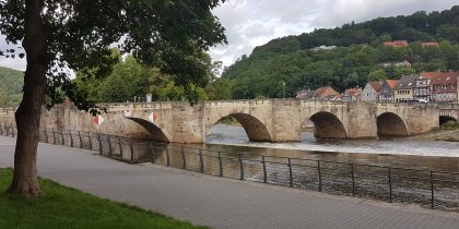 Hier queren wir die Weser. In der Altstadt machen wir eine kurze Trinkpause am Marktplatz. An der Lutherkirche vorbei verlassen wir die Stadt.